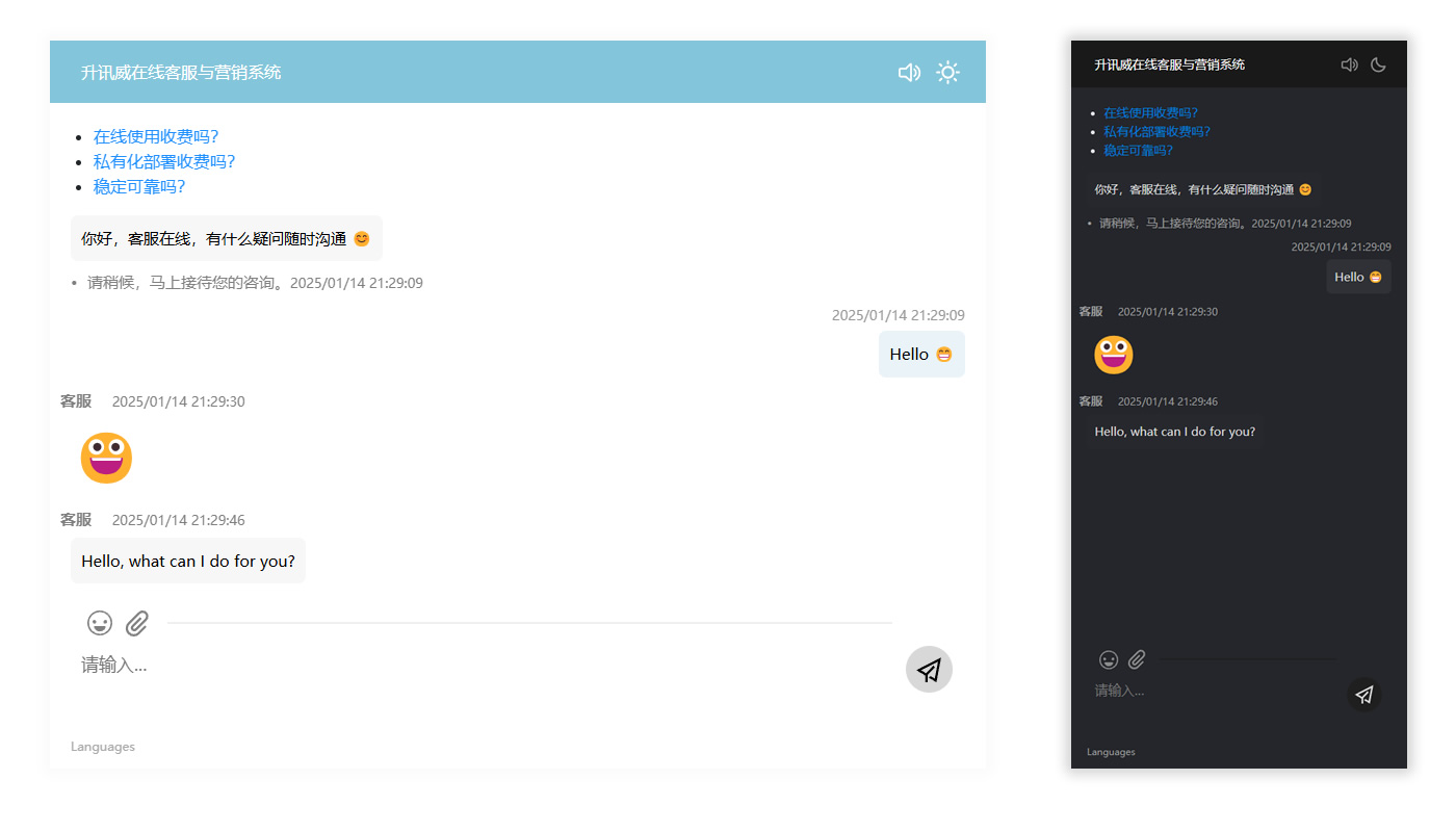支持明暗主题,支持 PC 和 手机,支持多国界面语言。
